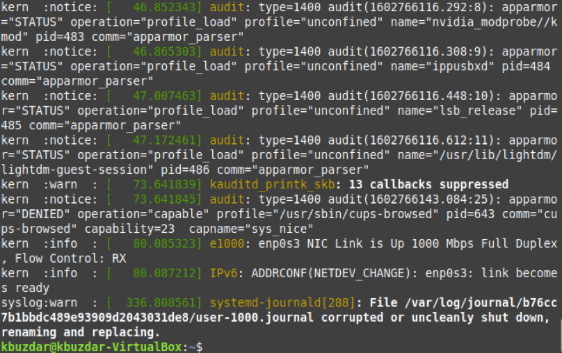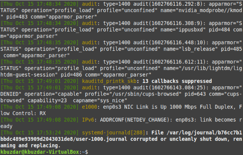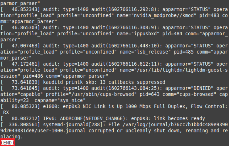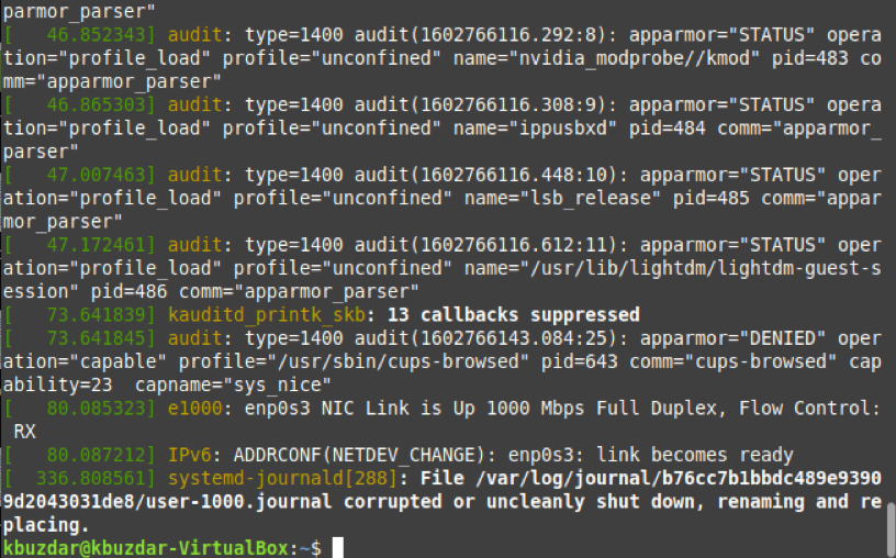 Thousands of events take place in the operating system that renders your OS, and these events generate a long list of diagnostic messages, as shown in Example #1. However, the Linux system also provides a way to clear this log.