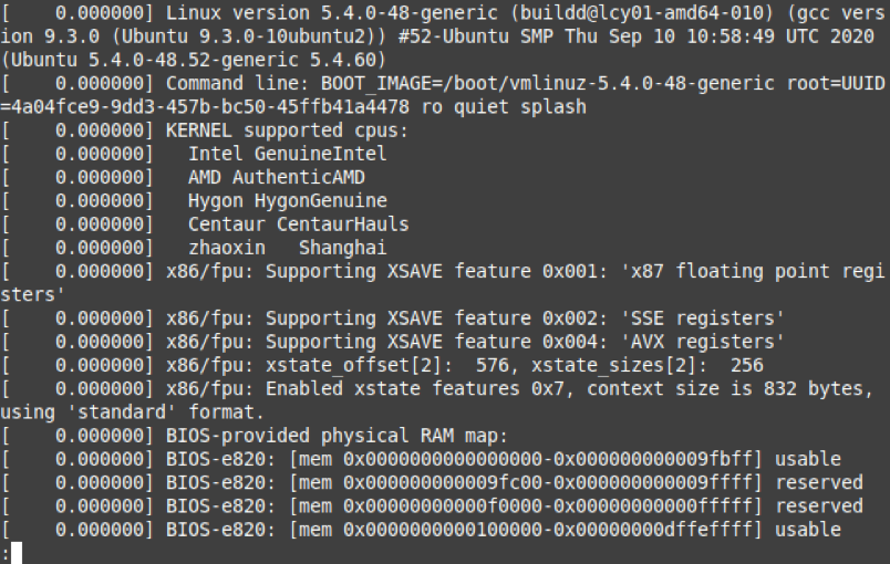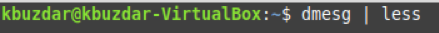 In the previous example, the list of diagnostic messages was very long and impractical to read. Therefore, you might want to view these messages page by page. which can be done by using the less command in Linux. In the command shown below, we are piping the output of the dmesg command to the less command so that diagnostic messages are displayed page by page.