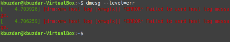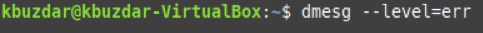First, run the command dmesg –level=LEVEL in your Linux Mint 20 terminal. Here, you need to replace LEVEL with a valid level (e.g., err, warn, info, notice). In our example, because we want to view all diagnostic messages of the error level, we replaced LEVEL with err.