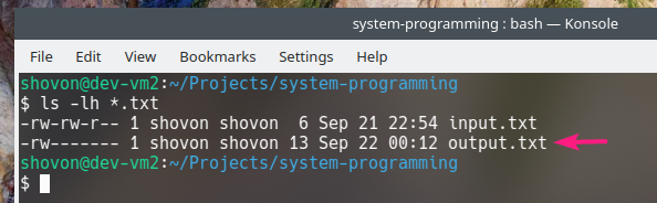 In this program, I did the same thing as in Example 1. The only difference is that I created a new file output.txt and used the file descriptor of output.txt as the default stdout file descriptor using the dup2() function. Now, all the output of the printf() function will be written to the output.txt file.