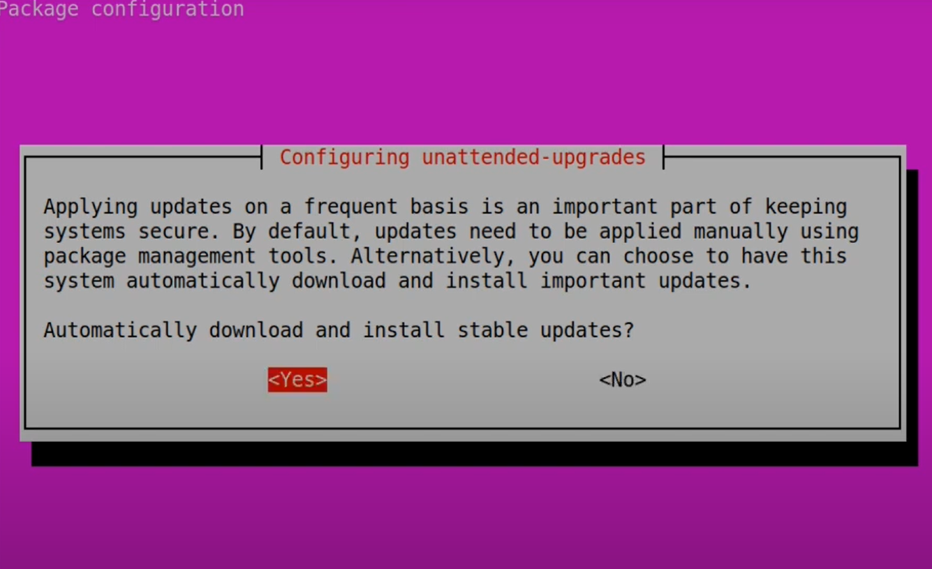 After executing the command, change the select No and press Enter button to disable unattended upgrades.