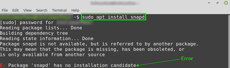 Initially, if you try to install the snap-in Linux Mint 20, you will get the error.