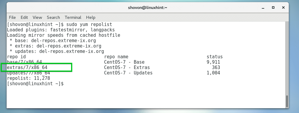 You can check whether CentOS 7 extras repository is enabled with the following command: