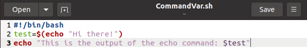For writing a Bash script in this file, double click on it to open it and then type the script shown in the image below in your Bash file. Here, the first line of the script i.e. “#!/bin/bash” shows that this file is in fact a Bash file. Then we have created a variable named “test” and have assigned it the value “$(echo “Hi there!”)”. Whenever you want to store the command in a variable, you have to type that command preceded by a “$” symbol. In this case, we wanted to store the “echo” command in the “test” variable so we have simply typed the “echo” command followed by a random message and have enclosed it in round brackets, and placed a “$” symbol before it. So now, if we want to execute this “echo” command, we will have to access the “test” variable. Therefore, to verify if the “echo” command stored in the “test” variable can be successfully executed or not, we have printed the output of the “test” variable on the terminal by making use of another “echo” command. After typing this script, you need to save your file and close it.