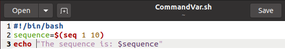 Open the Bash file that you have created in the method above and type the following script in it. Here, we have created a variable named “sequence”. Our goal is to print the numbers from 1 to 10 while using the “seq” command. For doing that, we have assigned the value “$(seq 1 10)” to the “sequence” variable. You can also specify any other range of numbers of your choice if you want. The first number after the “seq” command indicates the lower bound of the sequence whereas the second number refers to the upper bound. After typing this script, save your file and close it.