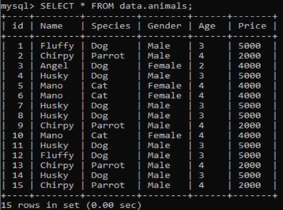 We have created a new table called ‘animals’ in our MySQL database ‘data’ having duplicate values. It has six columns with different values in it, e.g., id, Name, Species, Gender, Age, and Price providing information regarding different pets. Upon calling this table using the SELECT query, we get the below output on our MySQL command-line client shell.