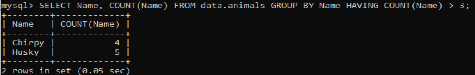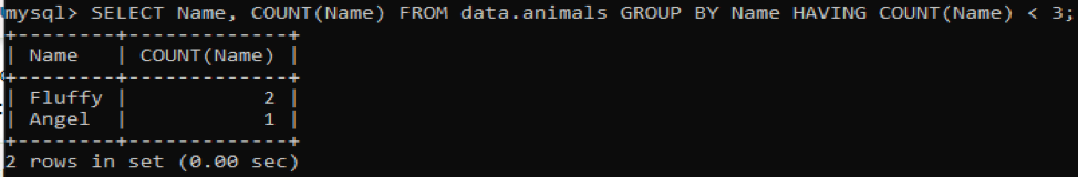 Now, we will try to find the redundant and repeated values from the above table by using the COUNT and GROUP BY clause in the SELECT query. This query will count the Names of pets which are located less than 3 times in the table. After that, it will display those Names as below.