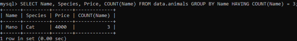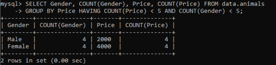 We have been using the same table called ‘animals’ having duplicate values. We got the below output while utilizing the above query for checking the duplicate values in multiple columns. We have been checking and counting the duplicate values for columns Gender and Price while grouped by the column Price. It will show the pet genders and their prices which are residing in the table as duplicates not more than 5.