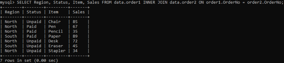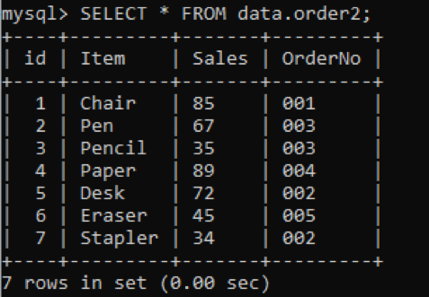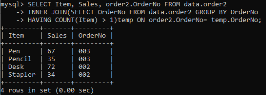 We are selecting three columns: Item, Sales, OrderNo to be shown in the output. While the column OrderNo is used to check duplicates. The inner join will select the values or rows having the values of Items more than one in a table. Upon executing, we will get the results below.