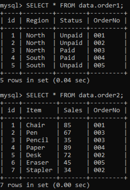 We have two tables, ‘ order1’ and ‘order2’, in our database having the ‘OrderNo’ column in both as displayed below.