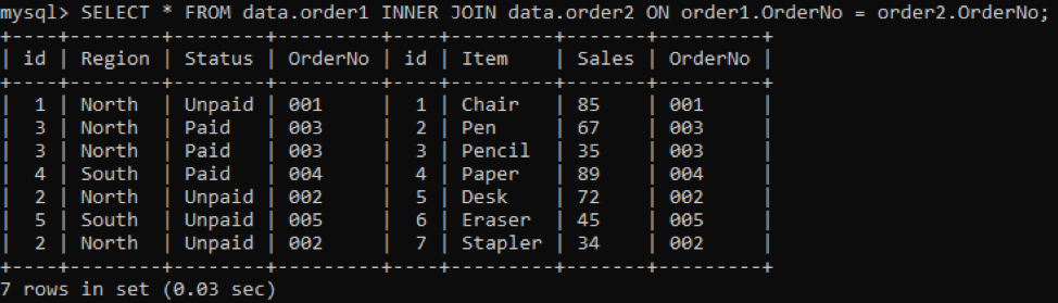 We will be using the INNER join to combine the duplicates of two tables according to a specified column. The INNER JOIN clause will get all the data from both the tables by joining them, and the ON clause will relate the same name columns from both tables, e.g., OrderNo.