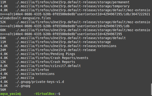 By using any of the three methods discussed in this article, one can easily find out the sizes of the directory and the subdirectories within it. Also, we have just demonstrated to you the examples in which we wanted to find out the sizes of the Home directory and the subdirectories within it. However, you can also find the sizes of any other directory and its subdirectories if you wish to, by using very simple methods. All you have to do is to provide the correct paths of those directories after the commands that are discussed above and you will be able to find the sizes of any directories of your Linux Mint 20 system.