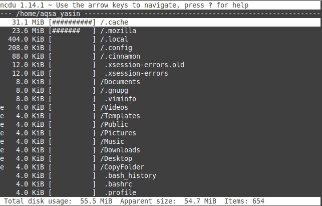 Here, we only wanted to find the sizes of the Home directory and its subdirectories that is why we did not have to mention any path. However, if you wish to find the size of any directory other than the Home directory, then its path must be mentioned after the “ncdu” command.