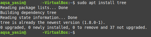 Before running this command, you must ensure that your Internet is working correctly, otherwise, this command will fail to execute. In our case, we already have installed the “tree” command on our system for some other purpose that is why our terminal displayed the following output after running this command: