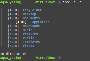 Again, the “-h” flag is used with the “tree –d” command to display the output in a human-readable format. Moreover, if you wish to find the size of any directory other than the Home directory, then you must mention its path right after the “tree –d –h” command.