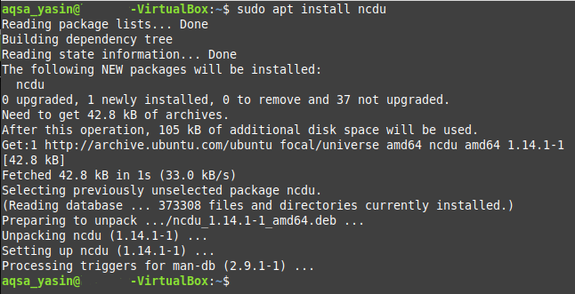 Before running this command, you must ensure that your Internet is working correctly, otherwise, this command will fail to execute. This command will take a few minutes to install the “ncdu” command and all the required dependencies successfully, after which your terminal will display the output shown in the image below: