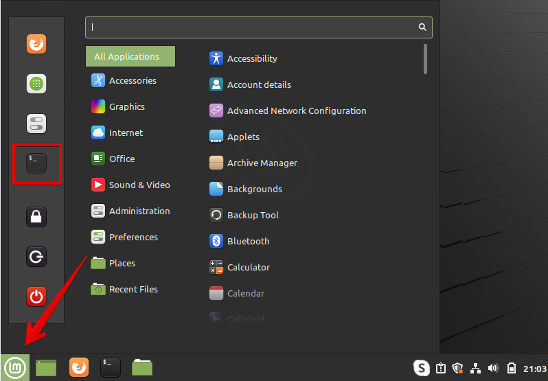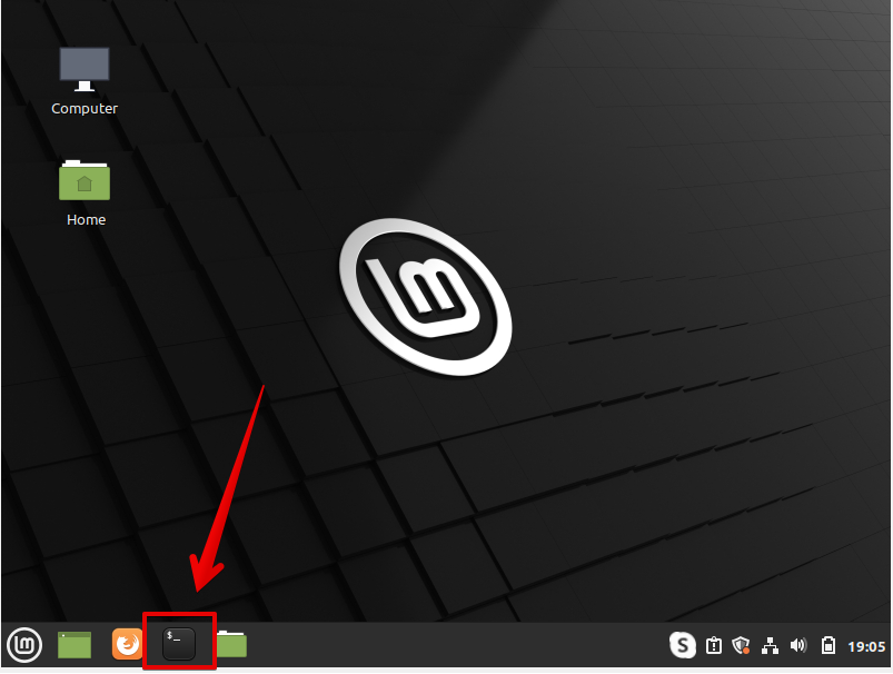 To open the terminal application, just log in to your Linux Mint 20 system and then click on the terminal icon that will be displayed on the taskbar.