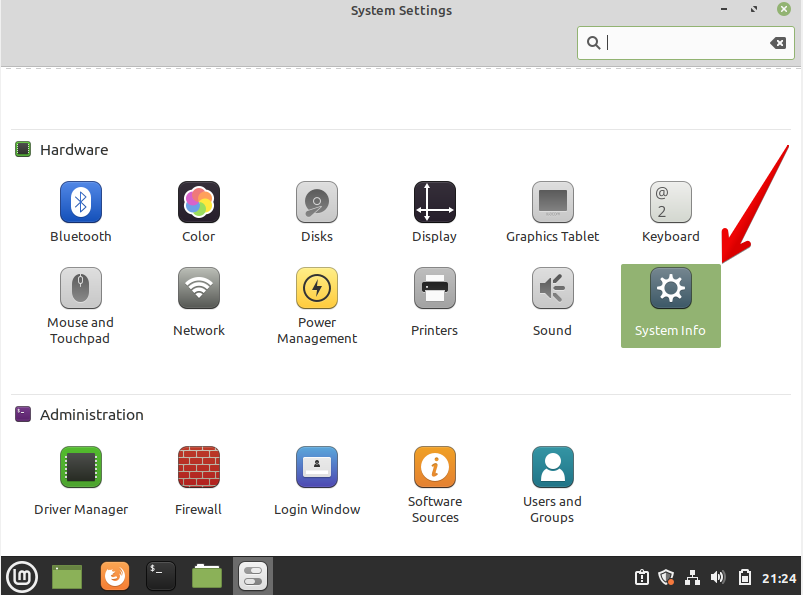 - Once you click on the system settings, the following window will display your system where you will see the different management applications. Scroll the mouse cursor on the displayed window and click on the ‘system info’ icon as follows: