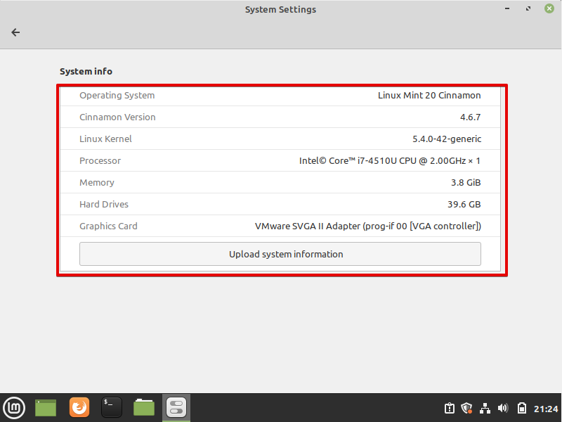 From the above screenshot, you can get the details about the currently installed operating system, cinnamon version, Linux kernel, and other system resources like processor, memory, hard drive, and graphics card.