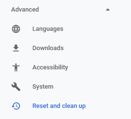 After opening Settings, go to Advanced and select the Reset and clean up option.
