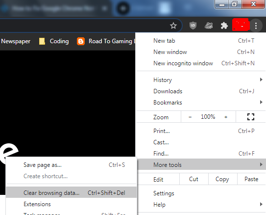 Another reason why your Chrome is maybe acting weirdly might be due to some corrupted cache that might have crept into your browser. In addition to this, sometimes having a large collection of browsing data might overburden your system and may make your Chrome run slower or not respond. Therefore, another good alternative would be to clear your browsing history along with your cache and cookies from your Google Chrome. To do this, open your Google Chrome, then click on the three vertical dots, go to the More tools option and finally select the Clear Browsing Data option. You can also open this using the shortcut Ctrl + Shift + Delete.