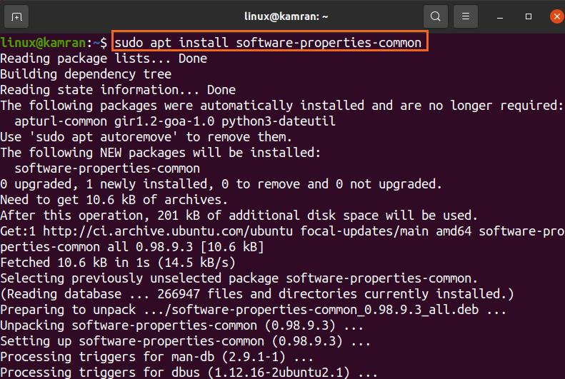 Fire up the terminal and complete the below-given steps to install the software-properties-common package.