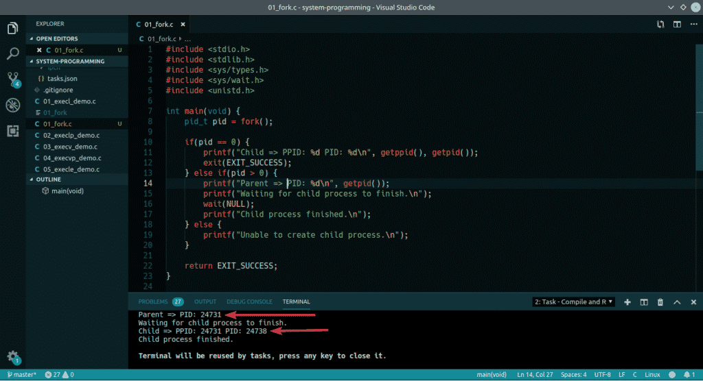 Here, I used fork() to create a child process from the main/parent process. Then, I printed the PID (Process ID) and PPID (Parent Process ID) from child and parent process. On the parent process wait(NULL) is used to wait for the child process to finish. On the child process, exit() is used to finish the child process. As you can see, the PID of the parent process is the PPID of the child process. So, the child process 24738 belongs to the parent process 24731.