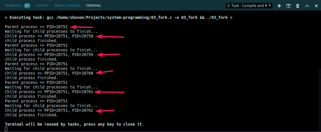 As you can see, the Parent process ID is the same in all the child processes. So, all of them belong to the same parent. They also execute in linear fashion. One after the other. Controlling child processes is a sophisticated task. If you learn more about Linux system programming and how it works, you will be able to control the flow of these processes anyway you like.