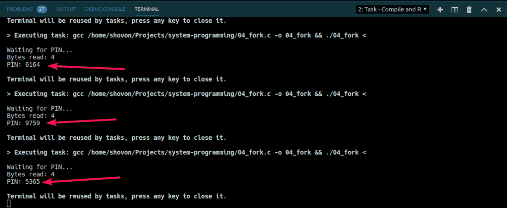 In the following example, I’ve generated a 4-digit PIN code in a child process and send it to the parent process, the main program. Then, I printed the PIN code from there.