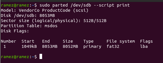 To check if your device has been partitioned correctly, run the following command to print the partition table: