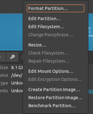 Over here, click on the gear icon present below the Volumes section and then select Format Partition from the choices given.