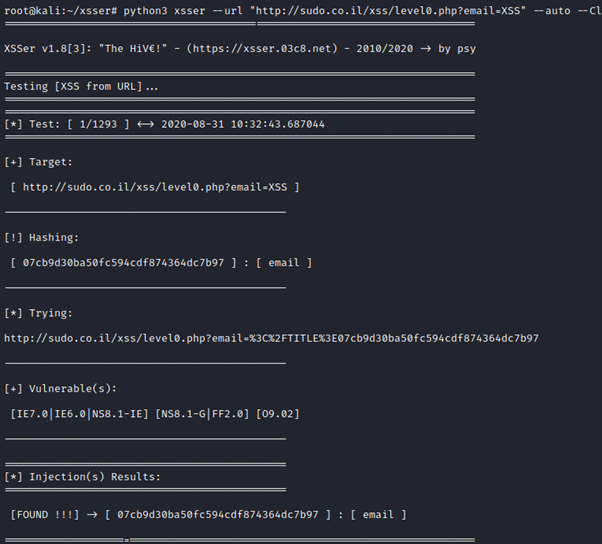 Here is a site that challenges you to exploit XSS. We will find a few vulnerabilities by using xsser. We give the target URL to xsser, and it will start checking for vulnerabilities.