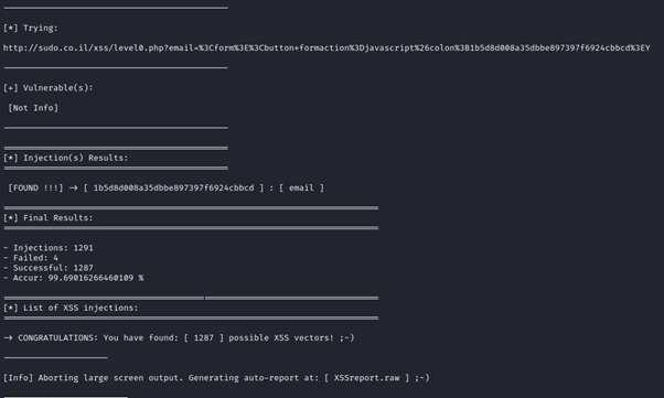 Once it is done, results are saved in a file. Here is an XSSreport.raw. You can always come back to see which of the payloads worked. Since this was a beginner level challenge, most of the vulnerabilities are FOUND here.