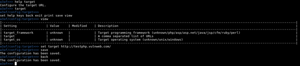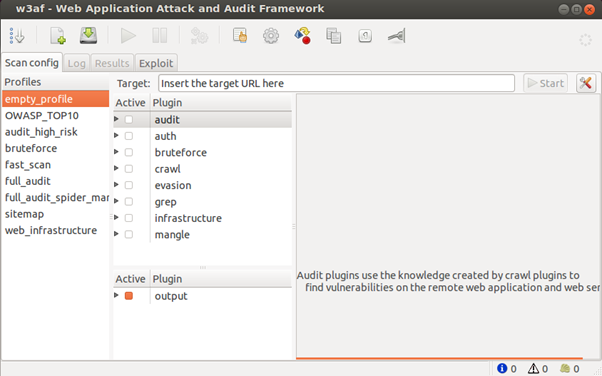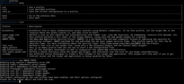 W3af comes with some profile that already has properly configured plugins to run an audit. To use profile, run command, use PROFILE_NAME.