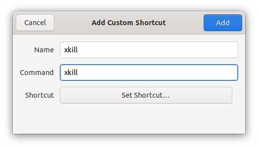 When the following dialog box appears, specify a user-friendly name for the shortcut in the Name field. Then, in the Command field, type xkill. Next, click the Set Shortcut button to select a shortcut for the xkill utility.
