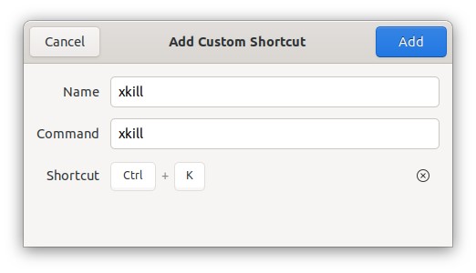 Now, whenever you need to need to kill a frozen application, you can press the shortcut keys to execute the xkill command.