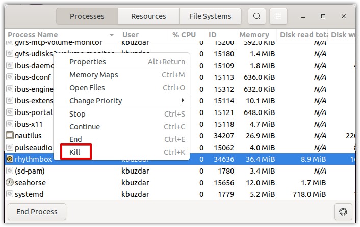 In the System Monitor application, there will be a list of processes that are currently running on the system. Select the process you want to kill and right-click it. From the menu that appears, select Kill to kill the selected process immediately.