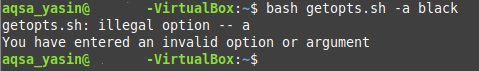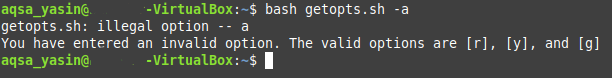 Finally, we will run our bash script with any random flag, i.e. a flag that is not valid or a flag that is not mentioned in our bash script says “-a” in the following manner: