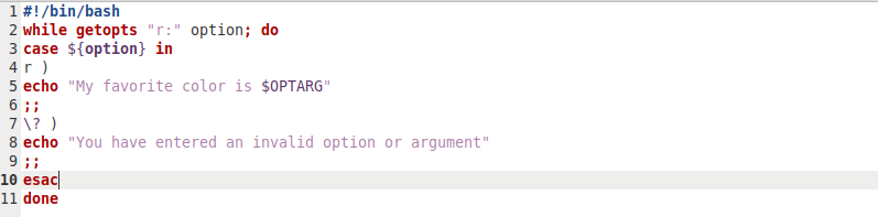The bash script used for this case is shown in the image below and is very much similar to the one we created for our case # 1. The only difference is that this time, we are not allowing multiple flags. The user is only allowed to enter the “-r” flag. However, the “:” colon after the “r” flag in the bash script indicates that the user is also supposed to provide an argument along with the flag. This argument will be stored in the default “OPTARG” variable. For displaying the value of the provided argument with the “echo” command, we have used a “$” symbol before the “OPTARG” variable.