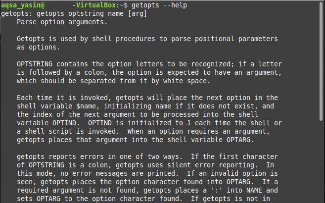 For an easier and a better understanding of the “getopts” command in Linux Mint 20, we have designed for you two example scenarios. Before heading on to these scenarios, you can check out the help manual of the “getopts” command in Linux Mint 20 terminal so that you may get the basic idea about the syntax of this command. You can see the help manual of this command by executing the “help” command: