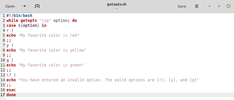 First, we will write a bash script in our Home directory. We have named this file as getopts.sh. The contents of this bash script are shown in the image below. In the bash script shown below, we have a “while” loop that runs on the “getopts” command. Here, this “getopts” command is used to take a flag as input from the user. The value of this flag can either be “r”, “y”, or “g” representing the “red”, “yellow”, and “green” colors respectively. The “option” variable will be used to store the value of the flag provided by the user. Then we have used a “case” statement on the value of the provided flag which will display a customized message depending upon the value of the “option” flag. Finally, we have closed the “case” block with the “esac” statement and the “do” block with the “done” statement.