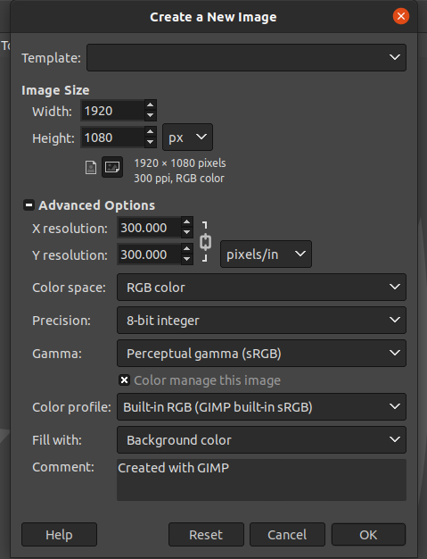 GIMP will ask for the image properties. It will come with the default values. Change them as necessary.