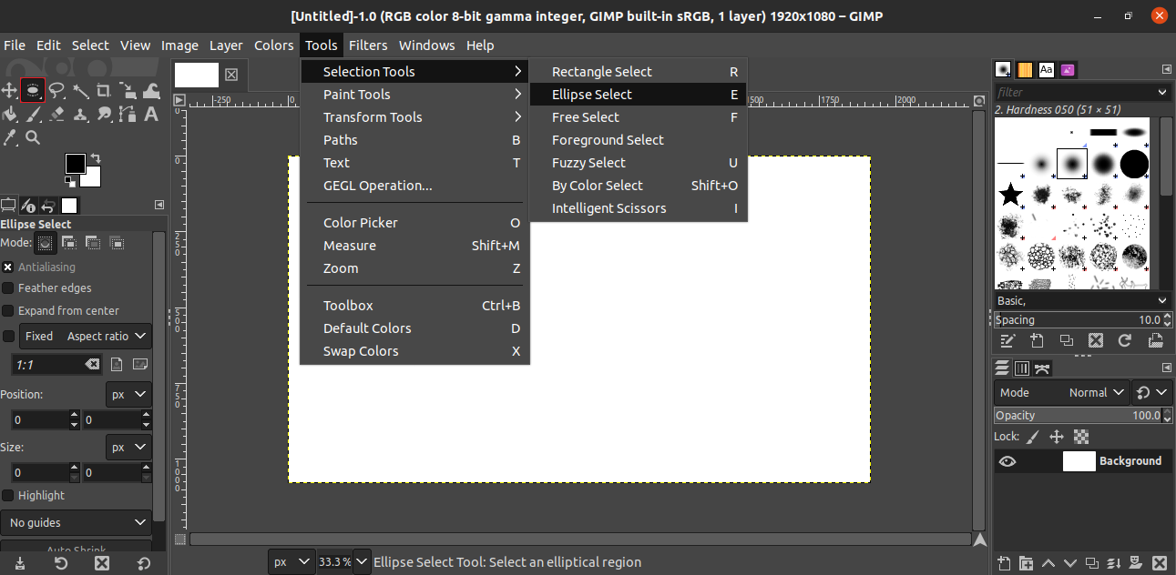 Open the “Ellipse select” tool from Tools >> Selection Tools >> Ellipse Select. Alternatively, select it from the toolbox.