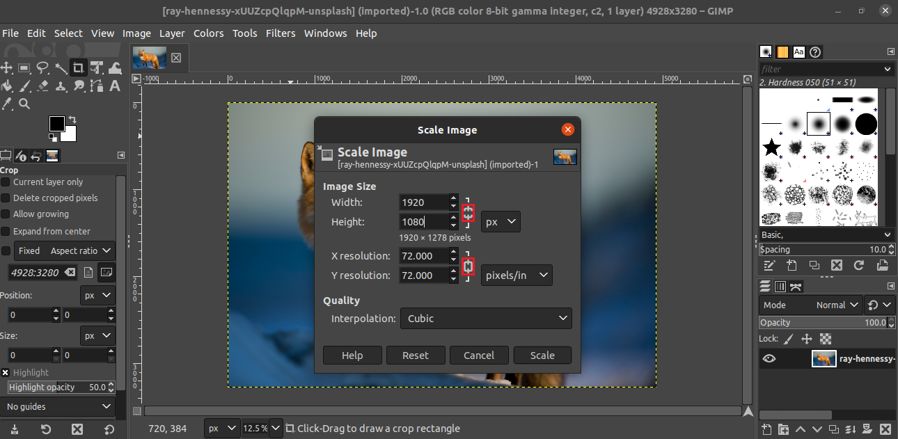 When the dialog box opens up, enter the target image dimension. The link button signifies whether the aspect ratio will be locked/unlocked.