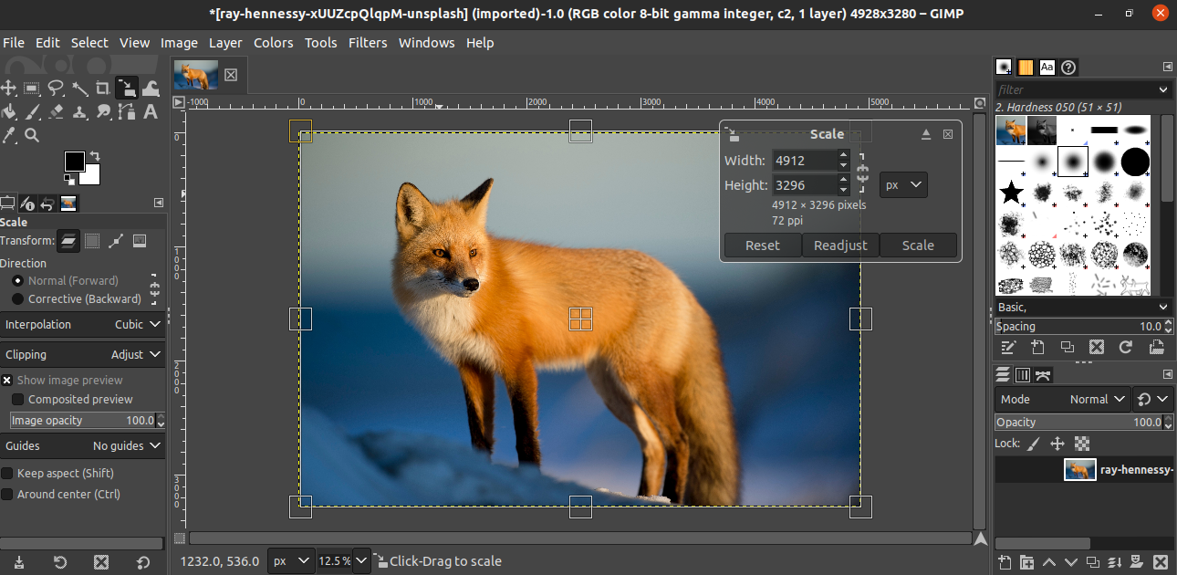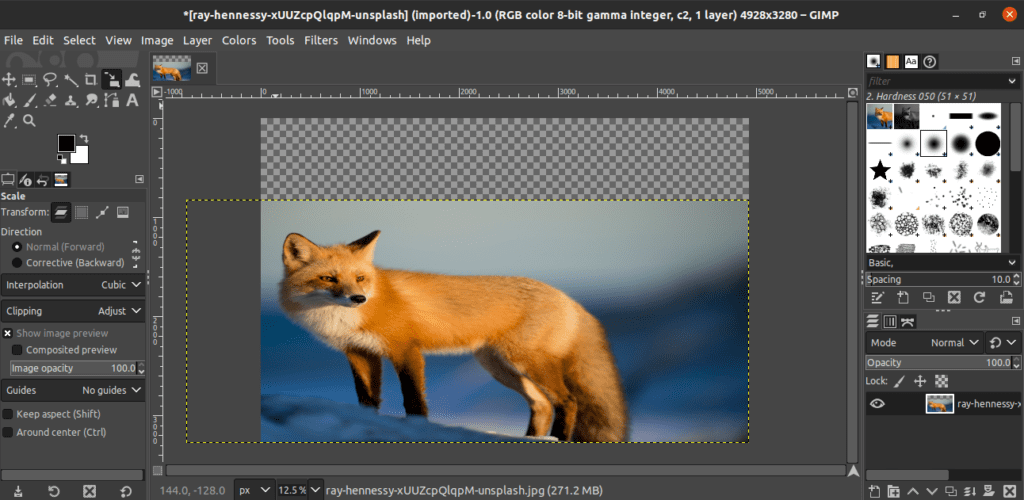 To do so, open the image in GIMP, and press “Shift + S”. This will start free-hand resizing. Similar to the prior method, make sure to lock/unlock the aspect ratio option.