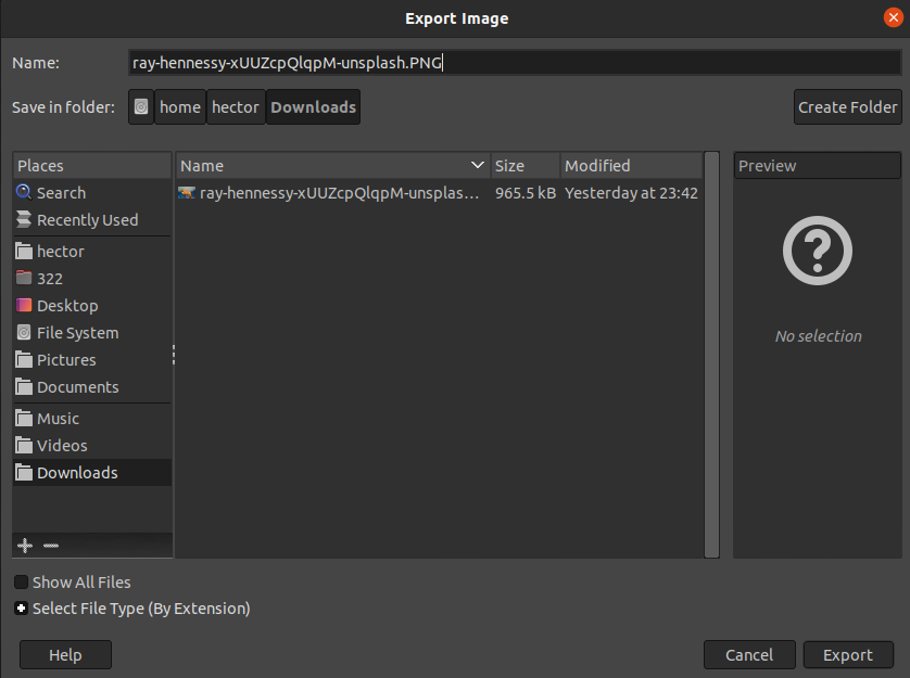 In this example, to save the file in PNG format, change the file extension from the file name to “.PNG”. Click “Export” to proceed.