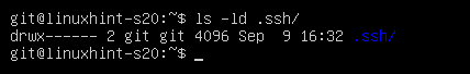 As you can see, the git user only has read (r), write (w), execute (x) permissions on the .ssh/ directory.
