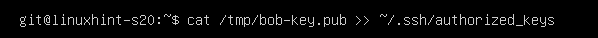 Once the Git server manager has the public key of bob, he can upload it to the Git server and add it to the .ssh/authorized_keys file as follows: