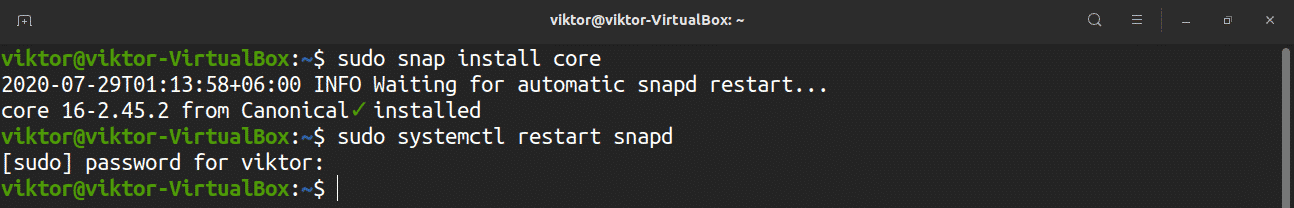 Let’s make sure that snappy is ready to work. Install the “core” snap and restart the service.