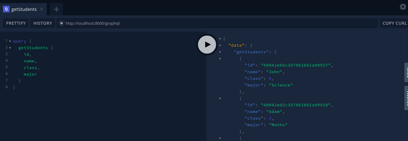 Similarly, add more students, and after adding the student, get all the students using GraphQL API.
